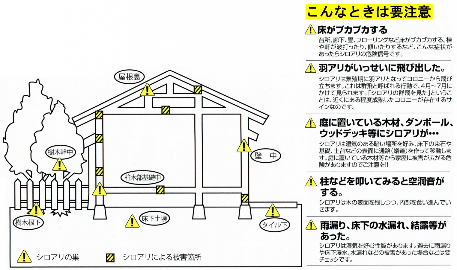 また、シロアリは突然湧いて出るわけではなく、近くの家から「羽アリ」として飛来して、新たな巣を作ります。雨漏りや水漏れなど、湿気が多い家では被害が広がりやすく、最終的に家全体に影響を与えることもあります。