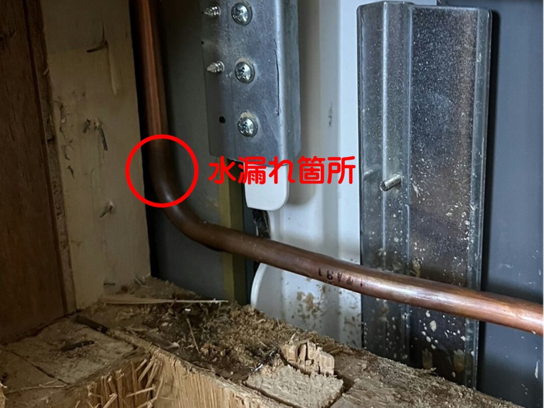 水漏れ箇所を特定するため、クローゼットの壁を開けると、コンクリートスラブに水が溜まっており配管部分から水が流れ落ちていました。