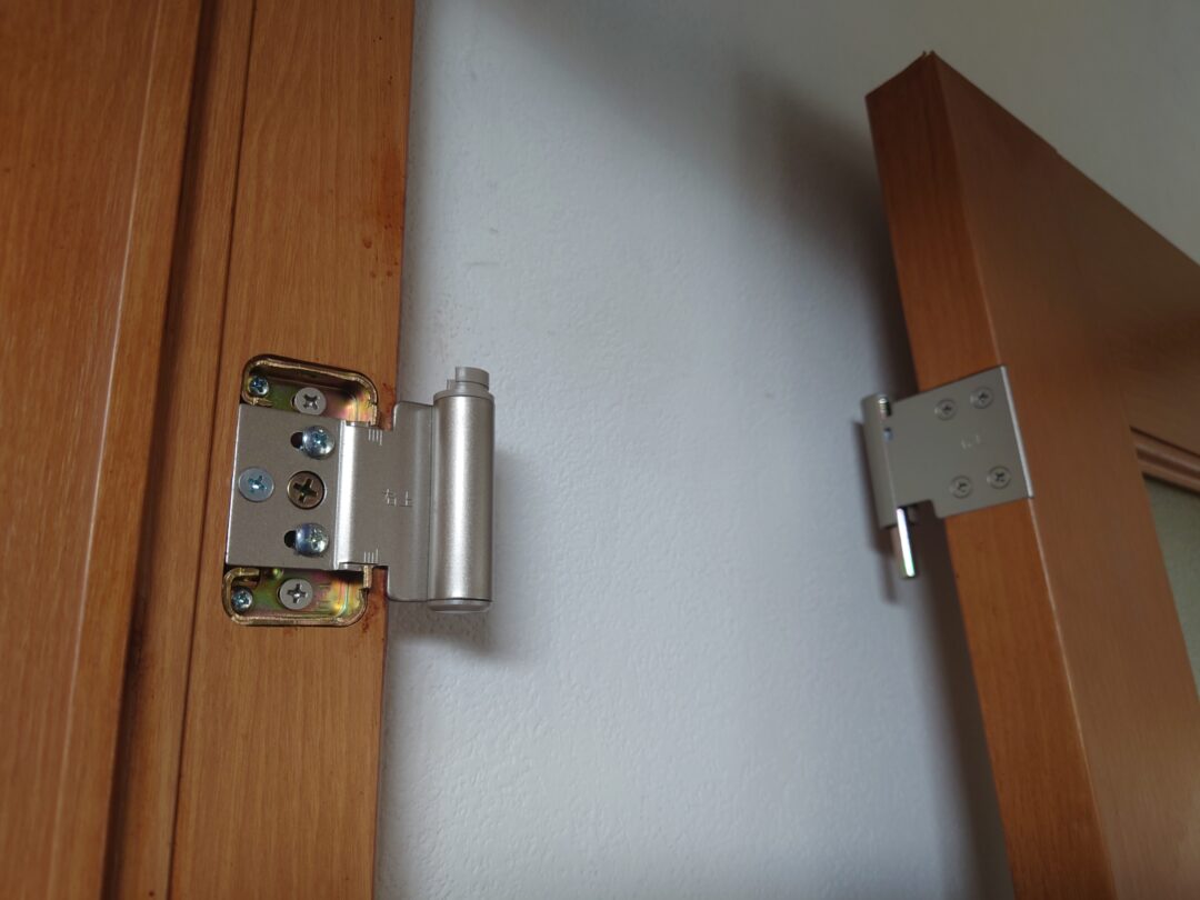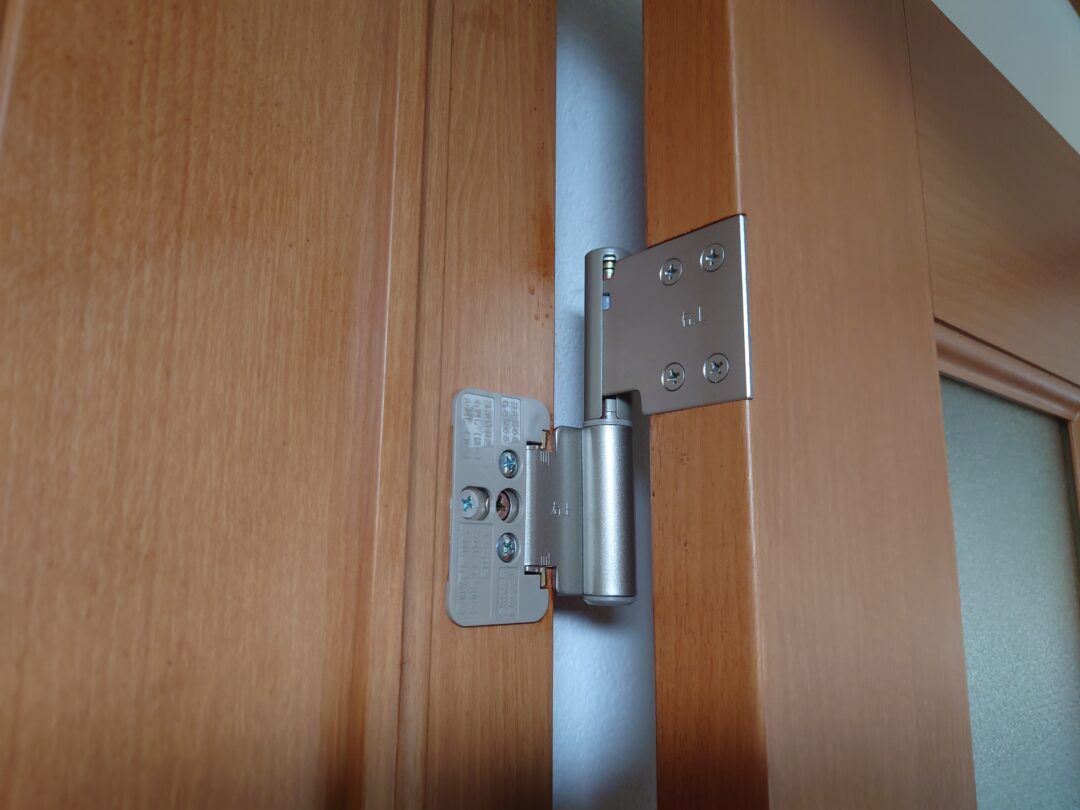 トステム(LIXIL)の室内ドアで「閉めると枠に当たり、スムーズに閉まらない」という症状が出ており、丁番交換を行いました。